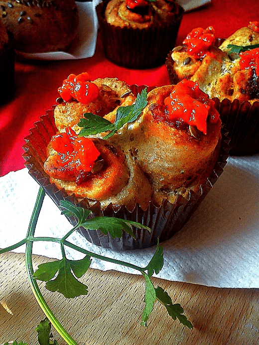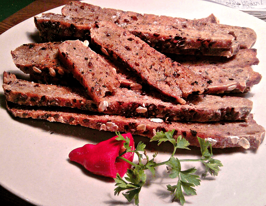 Integralni, domaći, brusketi, dekorisani delom paprike i peršunovim listom.