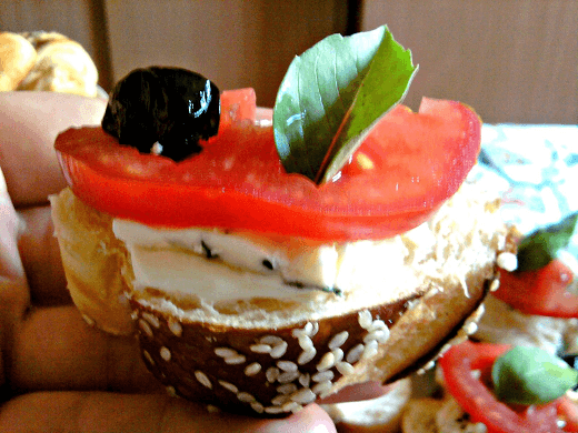 Kanapei na komadu bavarske kifle premazanom krem maslacem, potom stavljen komadić sira sa plavim plesnima, kriška paradajza, suva maslina i list bosiljka: