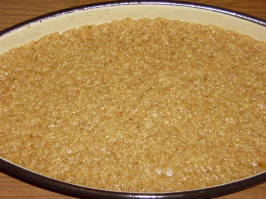 - Secer i vodu staviti u serpu i zagrejati. Kad provri, smanjiti temperaturu i kuvati jos 5 minuta. Skloniti sa ringle, dodati maslac i mesati da se otopi. Mleko u prahu, mlevenu plazmu i mlevene lesnike izmesati pa usuti u serpu. Promesati.