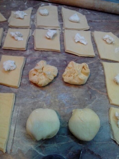 - U odgovarajucoj posudi staviti mlako mleko, izmrvljen kvasac, secer i nekoliko kasika brasna. Izmesati varjacom i pustiti da krene kvasac. U drugoj posudi staviti jaje, so, maslinovo ulje, isipati nadosli kvasac, postepeno dodavati brasno i umesiti glatko testo. Testo pokriti kesom da se ne bi stvorila korica. Ostaviti na toplom da nadodje. Nadoslo testo podeliti na dva dela a svaki deo na 5 loptica. Svaku lopticu rastanjiti do velicine plitkog tanjira i premazati margarinom. Petu koru ne premazivati. Redjati jednu na drugu. Razviti veliku cetvrtastu koru na nekoliko centimetara debljine i tockicem za testo iceci kvadrate na 5×5 cm. Na svakom kvadratu staviti punu kasicicu sira za mazanje.