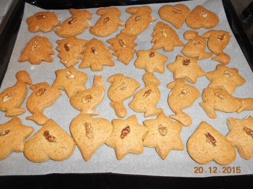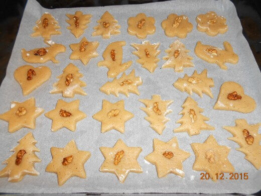 - Ređajte u pleh i na sredinu svake ubodite polovinu oraha.