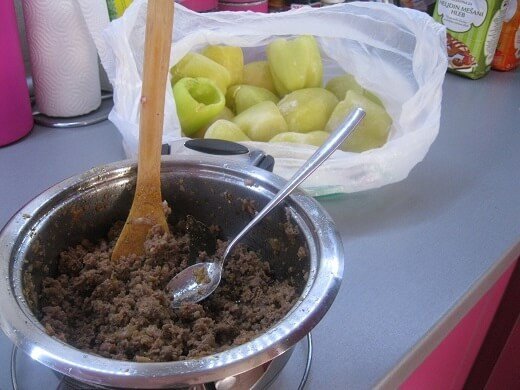 - Paprike operite i očistite od peteljke i semena.Crni luk sitno iseckajte.Na ulju propržite crni luk i lovorov list pa dodajte mleveno meso.Začinite morskom solju,Aleva natur začinom,mlevenim biberom a na kraju prženja dodajte alevu papriku.